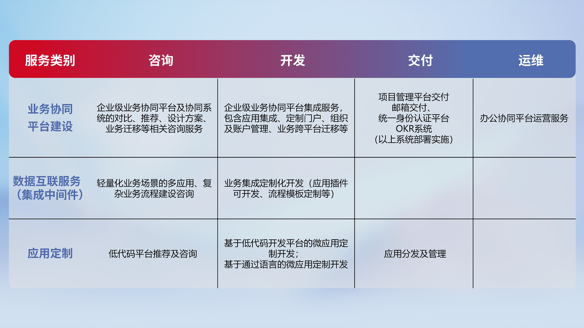 针对钉钉、、企微、、、、IDaas等平台级产品提供产品的规划、、、、方案、、交付、、、、定制化开发等服务,,,实现如统一协同办公、、智能客户服务、、、、混合会议管理、、、智能数据查询、、等业务场景,,,,实现数字化转型。。。。