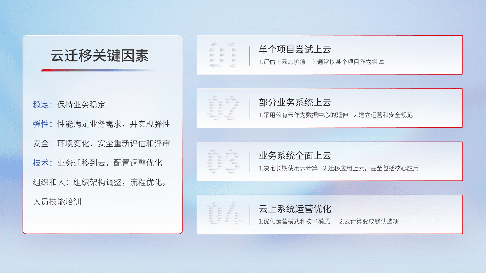 结合实际业务,,从规划设计、、、、云平台选型、、、、云原生改造、、、、数据迁移、、、集成交付,,,迁移全过程为客户识别最佳上云路径,,,,做好风险识别管理,,,设计网络架构、、、、身份权限、、、、安全审计合规、、操作审计、、、、日志审计、、、、监控告警策略、、、多站点容灾设计等,,对云上基础设施进行整体规划,,提升IT治理水平,,,以满足弹性、、、高可用、、、高性能的需求。。。