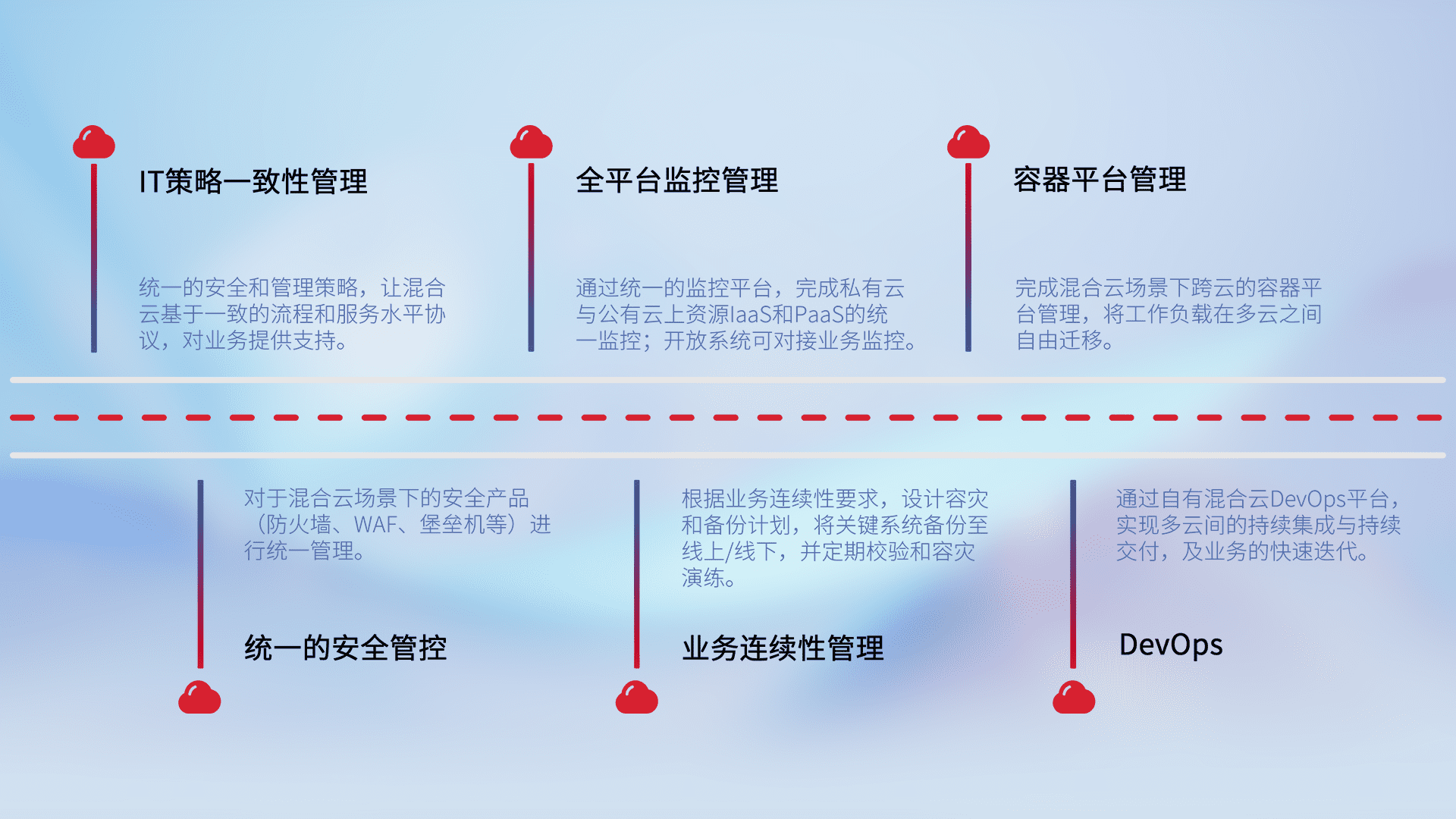 通过多云纳管,,以统一的资源数据模型把客户的云资源进行抽象和封装,,,进而实现对多云资源的统一操作,,保障云资源管理的可靠性、、、、稳定性与可用性。。。量身定制化运维内容,,,配置、、开发运维、、、补丁管理、、、、备份、、监控、、、、认证和访问管理、、审计和日常巡检等,,保障在用云过程中的可靠度,,,,稳定度以及高可用率。。